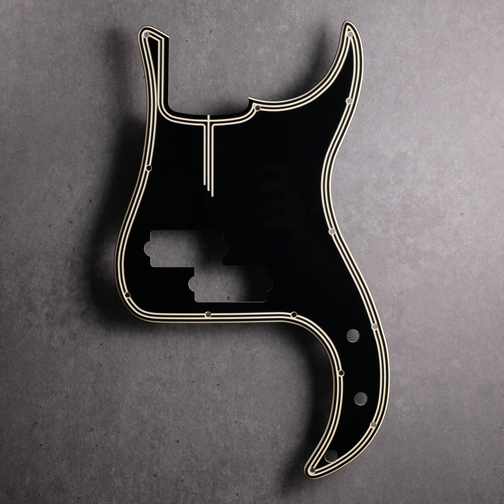 Precision Bass 13-hole pickguard cut by CNC for a precise fit, engraved with our original Streamline design in Cream/Black/Cream acrylic.