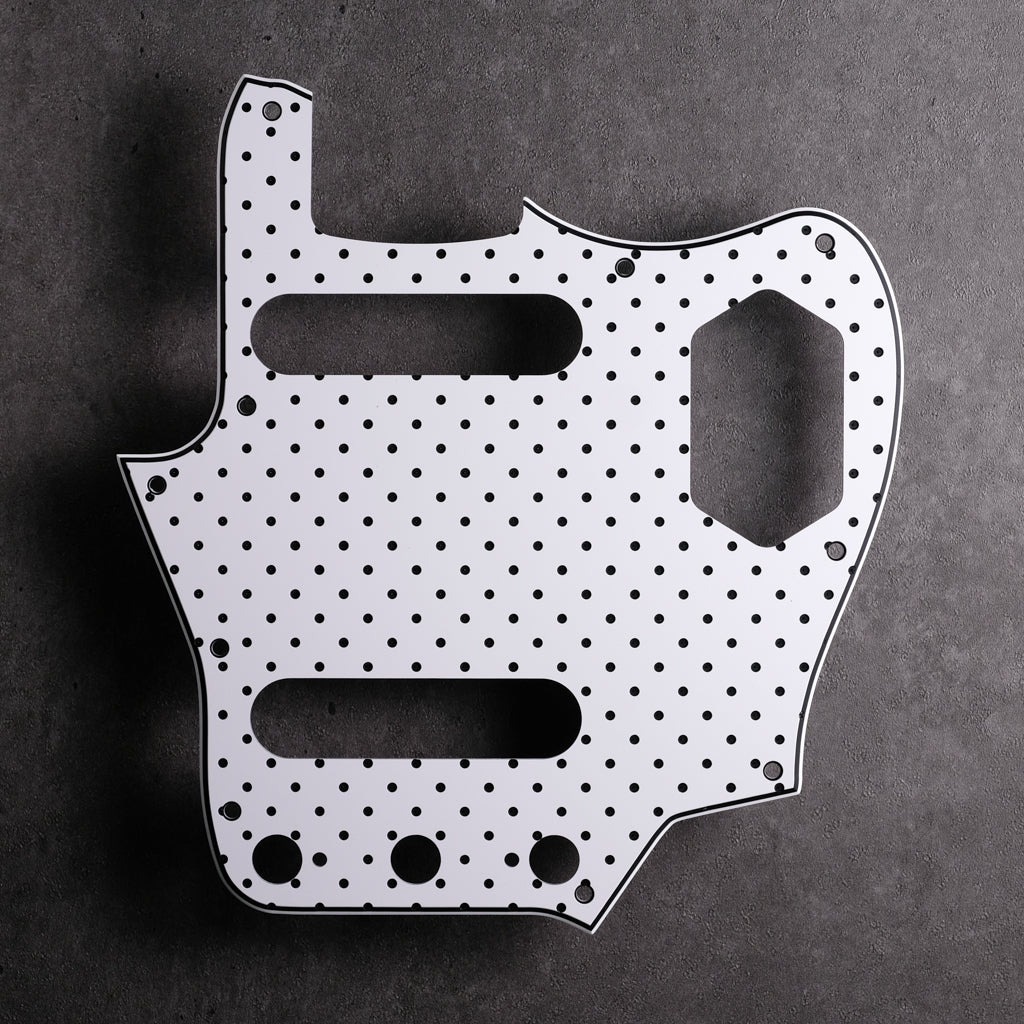 Jaguar pickguard cut by CNC for a precise fit, engraved with our original Four Thousand Holes design in Black/White/Black acrylic.